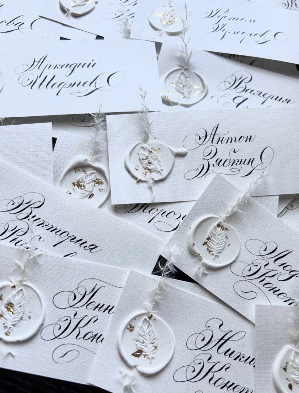 Рассадочные карточки с каллиграфией подчеркнут ваше внимание и особое отношение к гостям, они станут изящным украшением для вашего торжества.